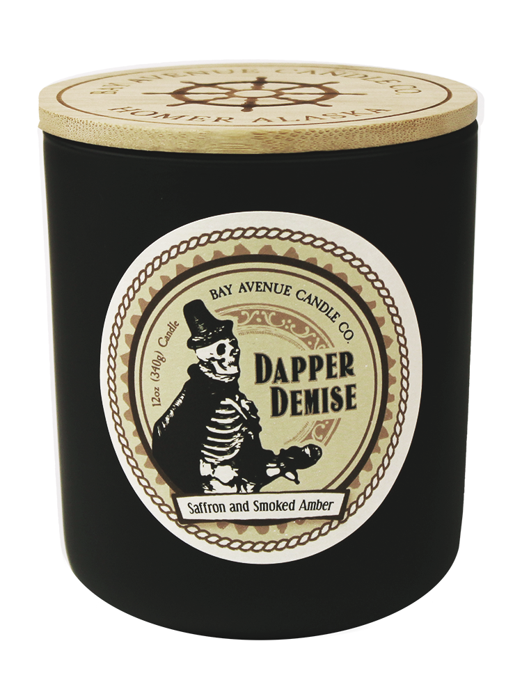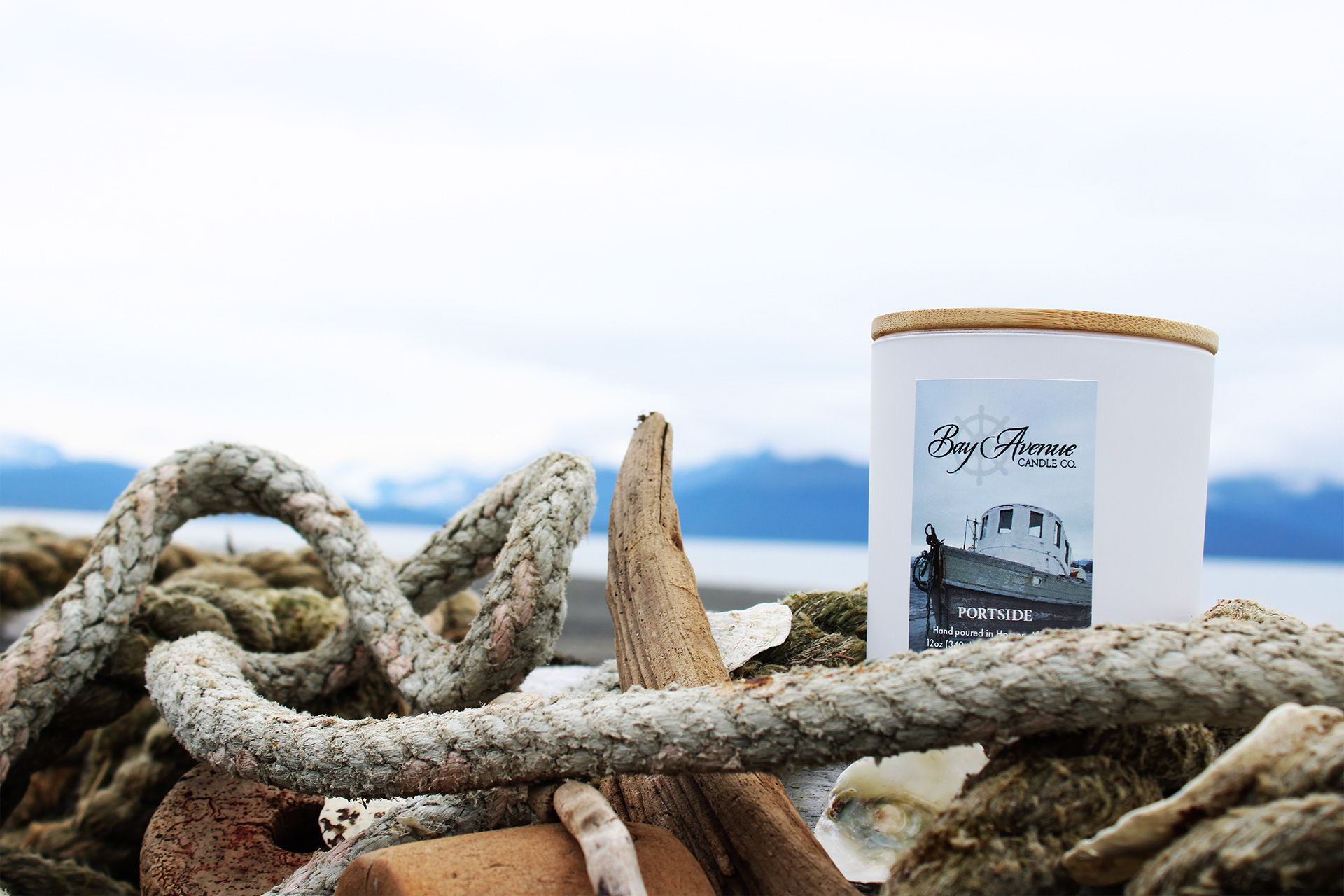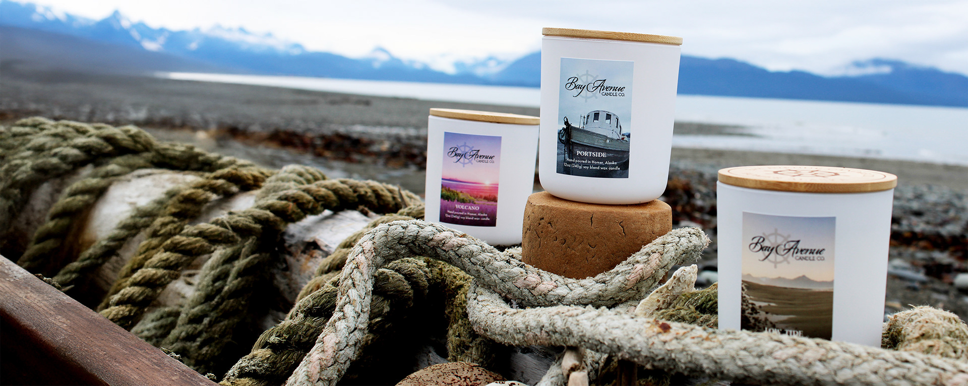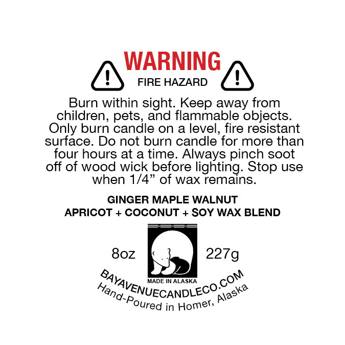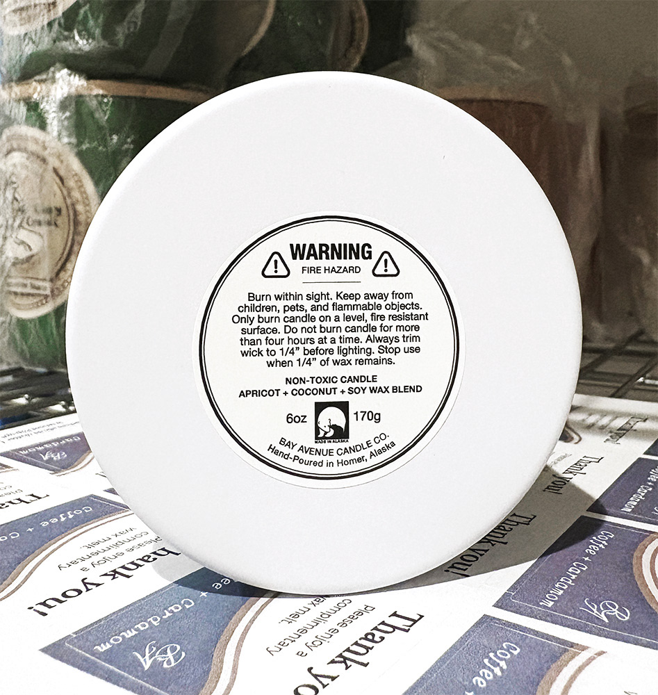Warning labels needed to comply with legal safety requirements, including burn instructions, product size, scent, and brand details such as the website and the Made in Alaska symbol.