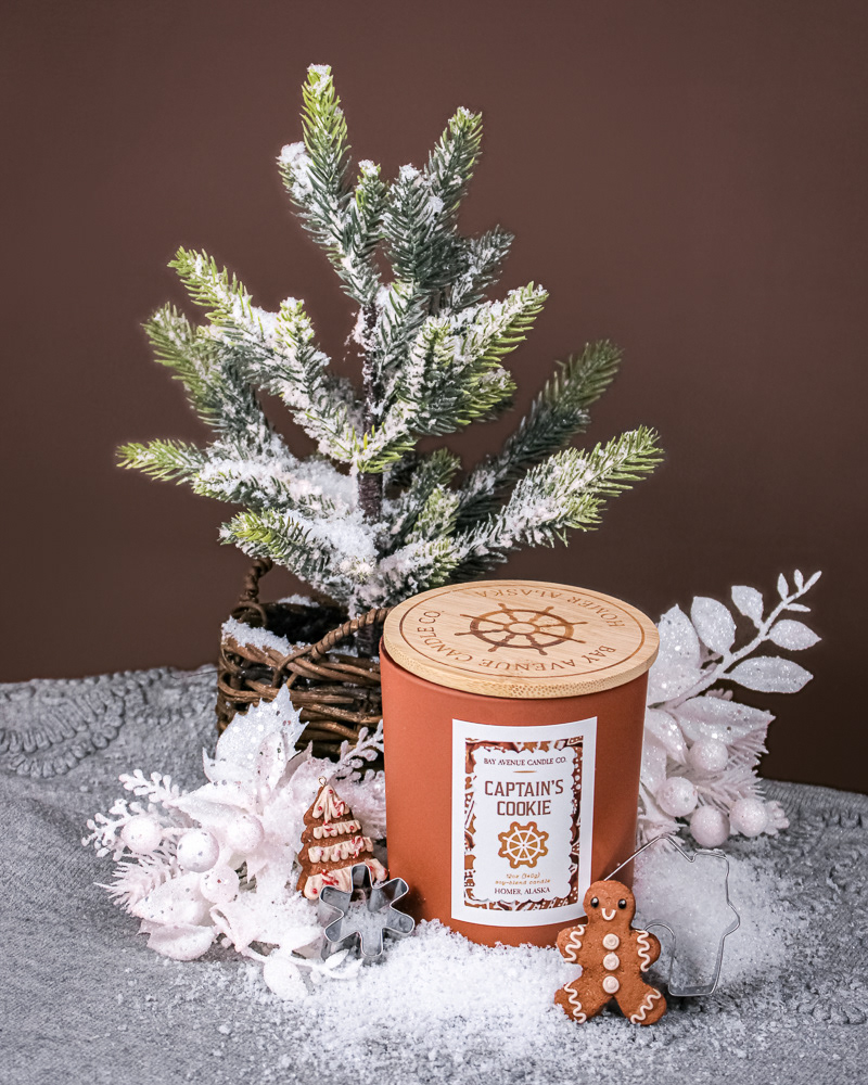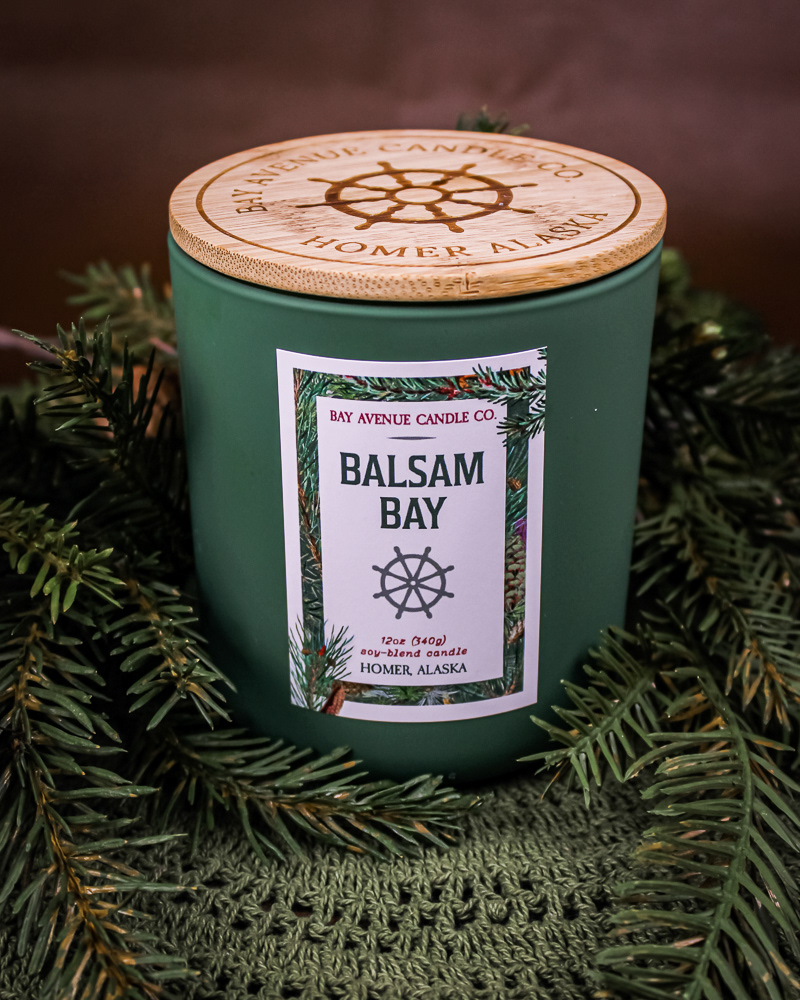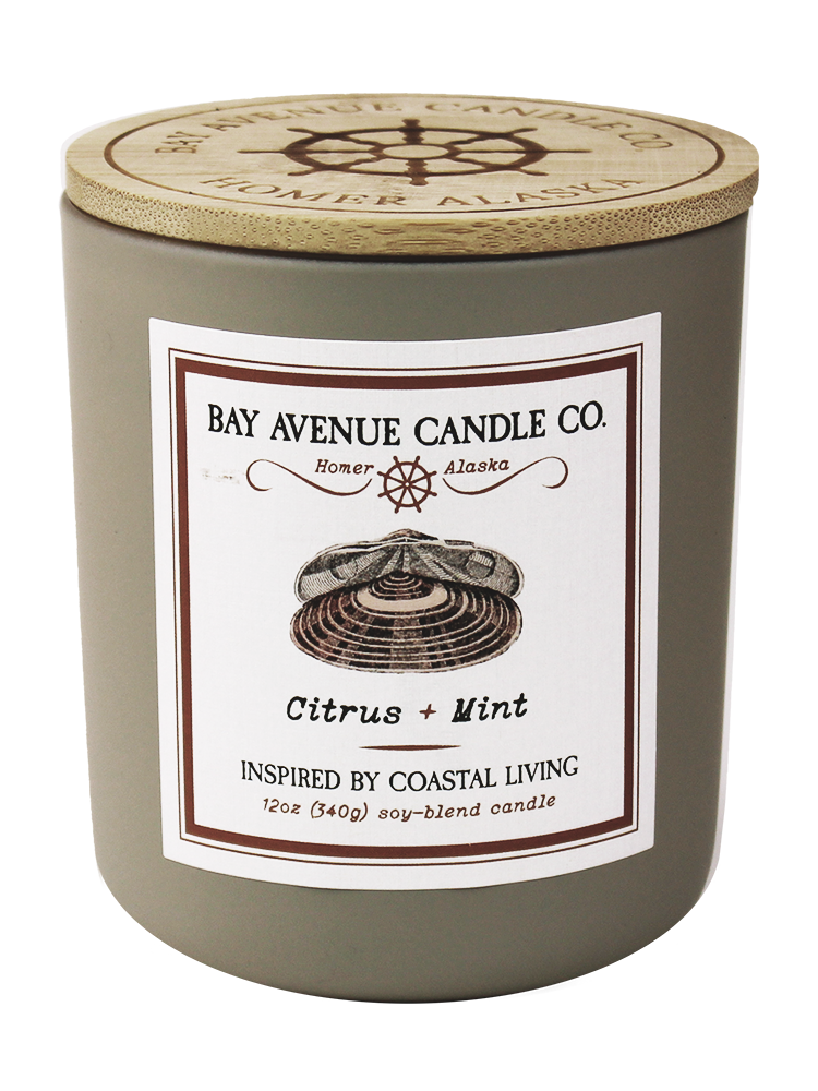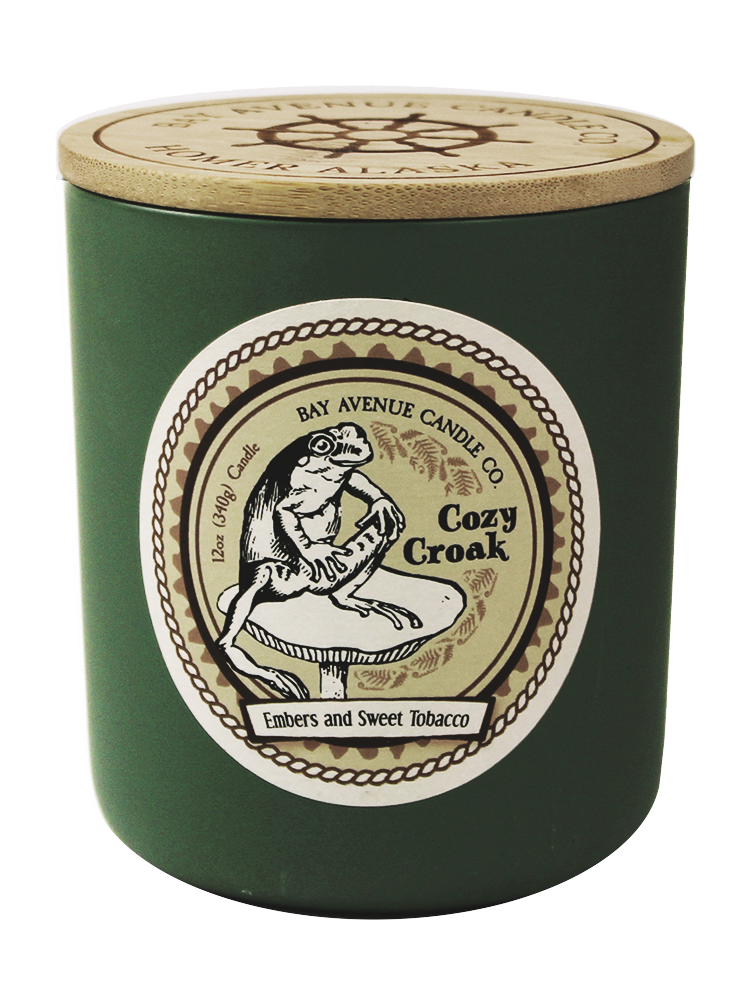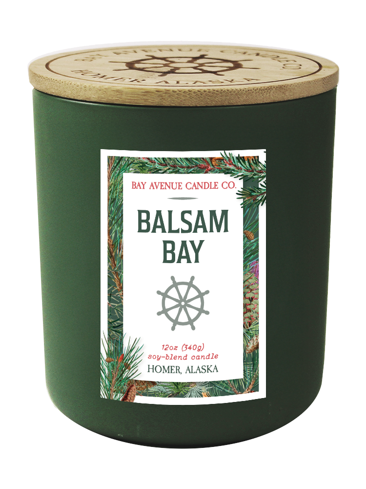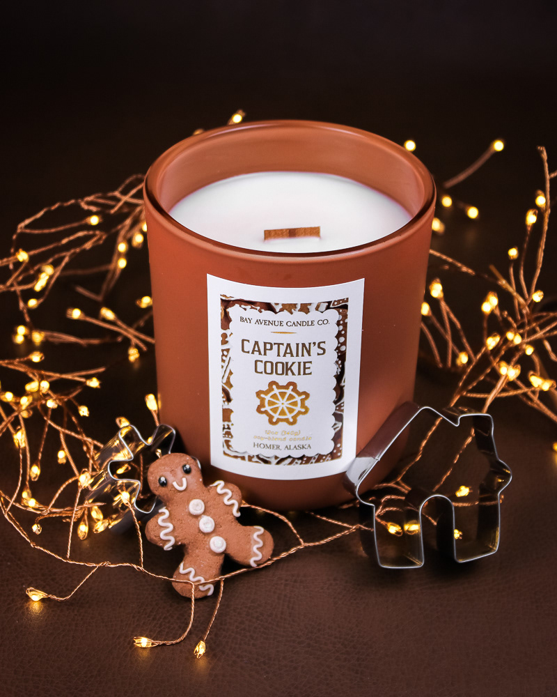 Warning labels needed to comply with legal safety requirements, including burn instructions, product size, scent, and brand details such as the website and the Made in Alaska symbol.