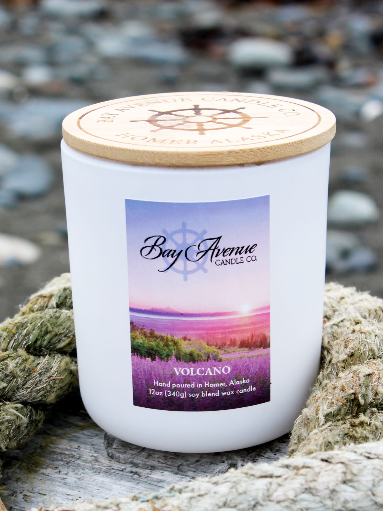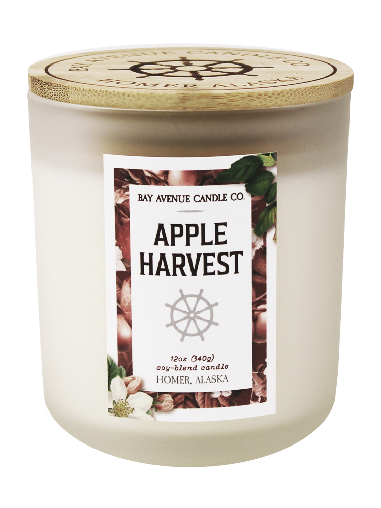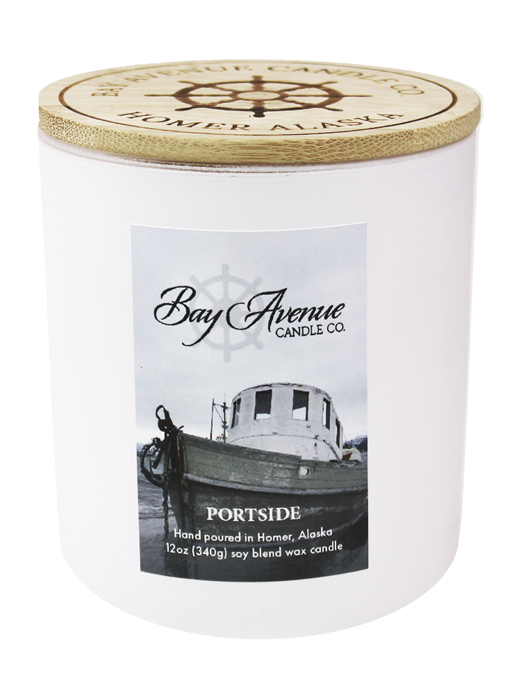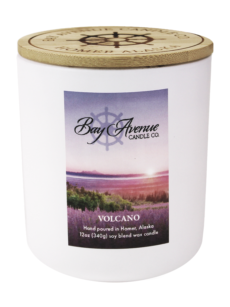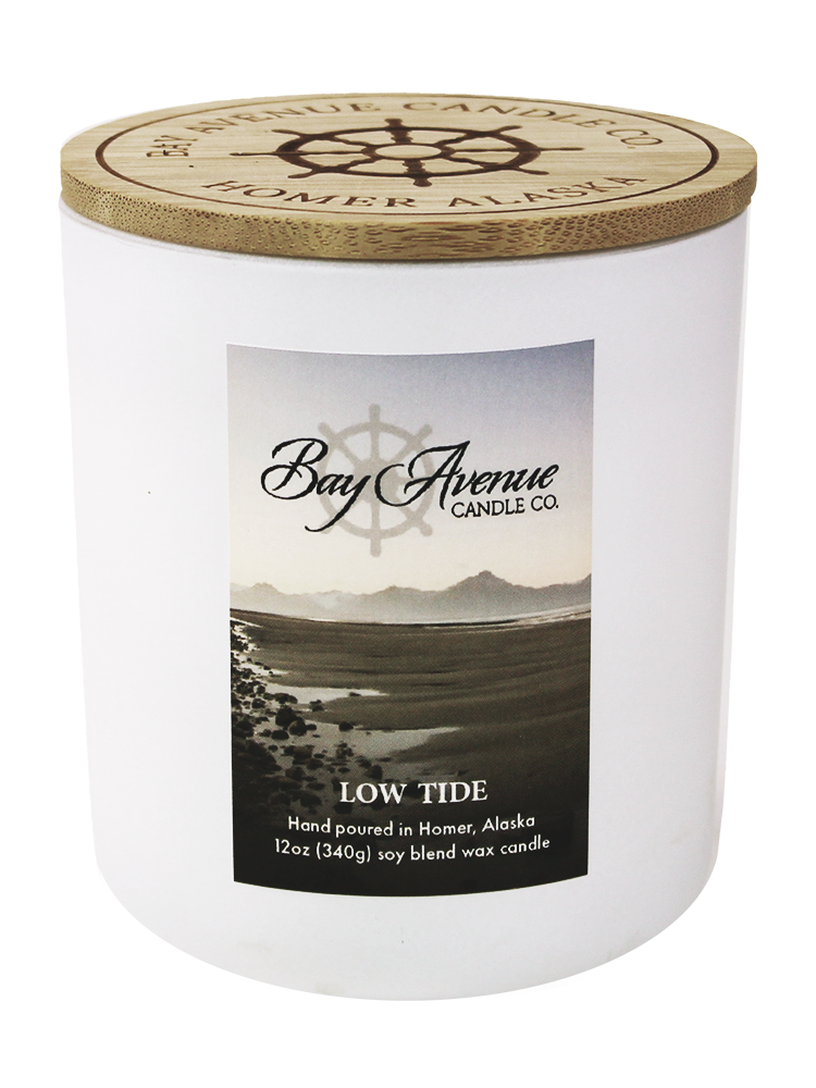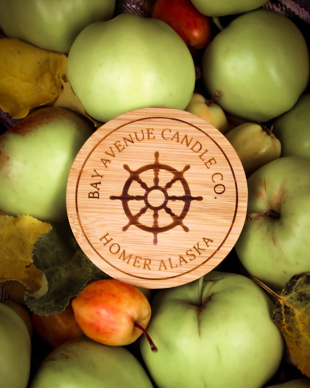 Warning labels needed to comply with legal safety requirements, including burn instructions, product size, scent, and brand details such as the website and the Made in Alaska symbol.
