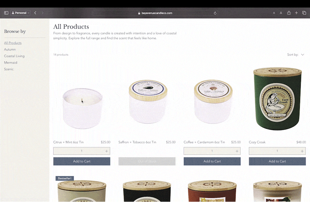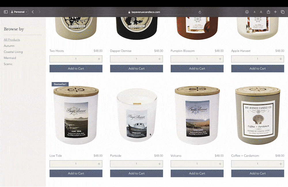 In addition to candle designs, I created a new online storefront for the company. They had previously sold their products on Etsy. The dedicated website allowed them to present their high-quality goods in a cleaner and more professional setting.